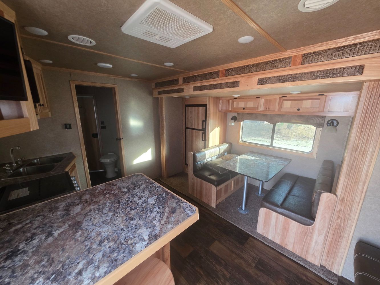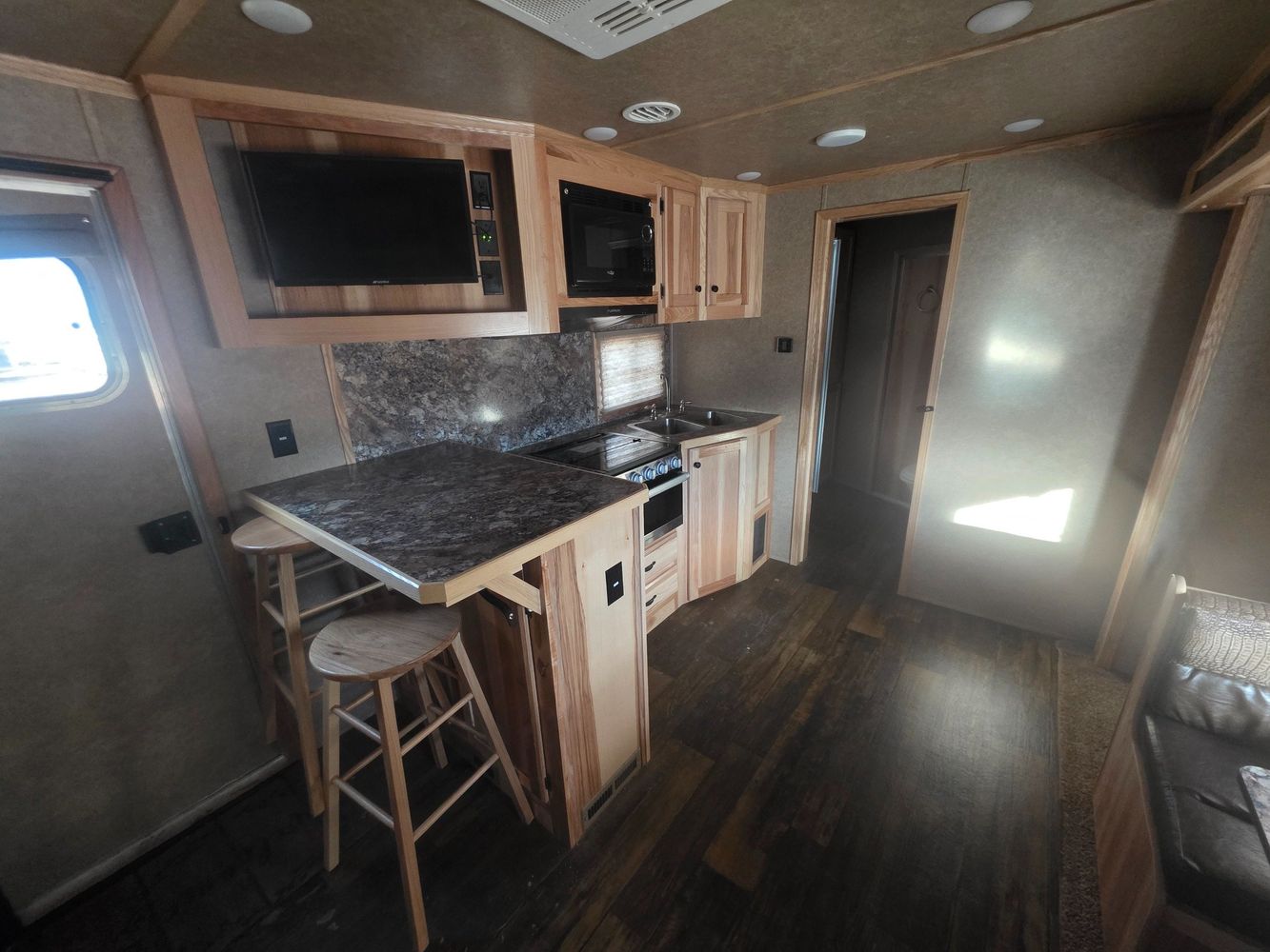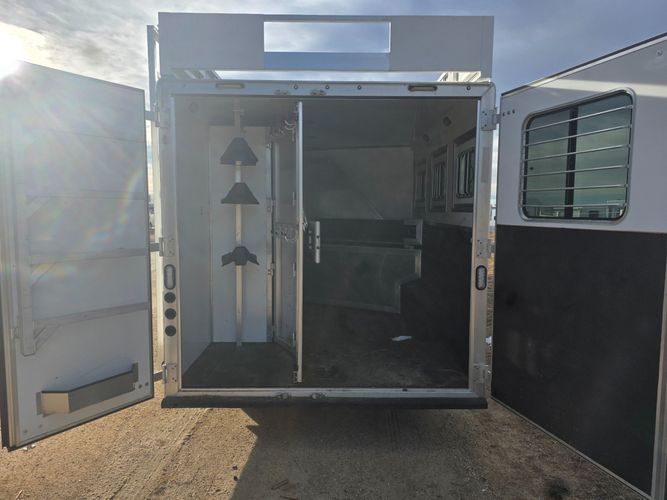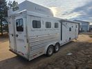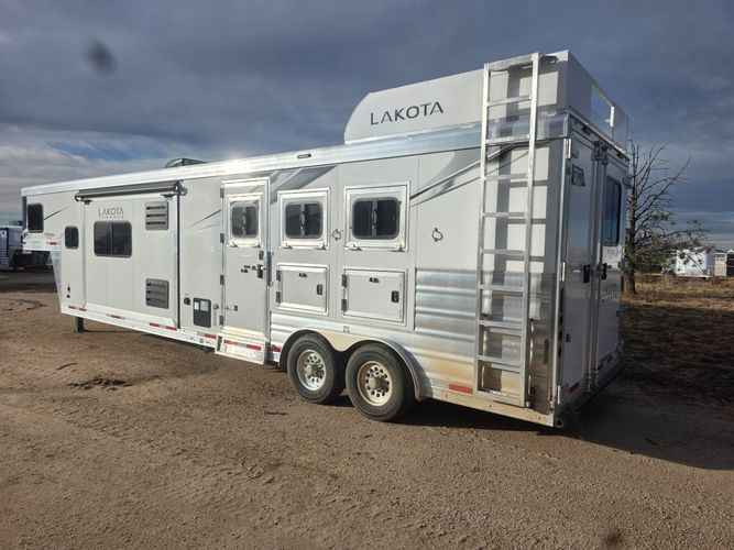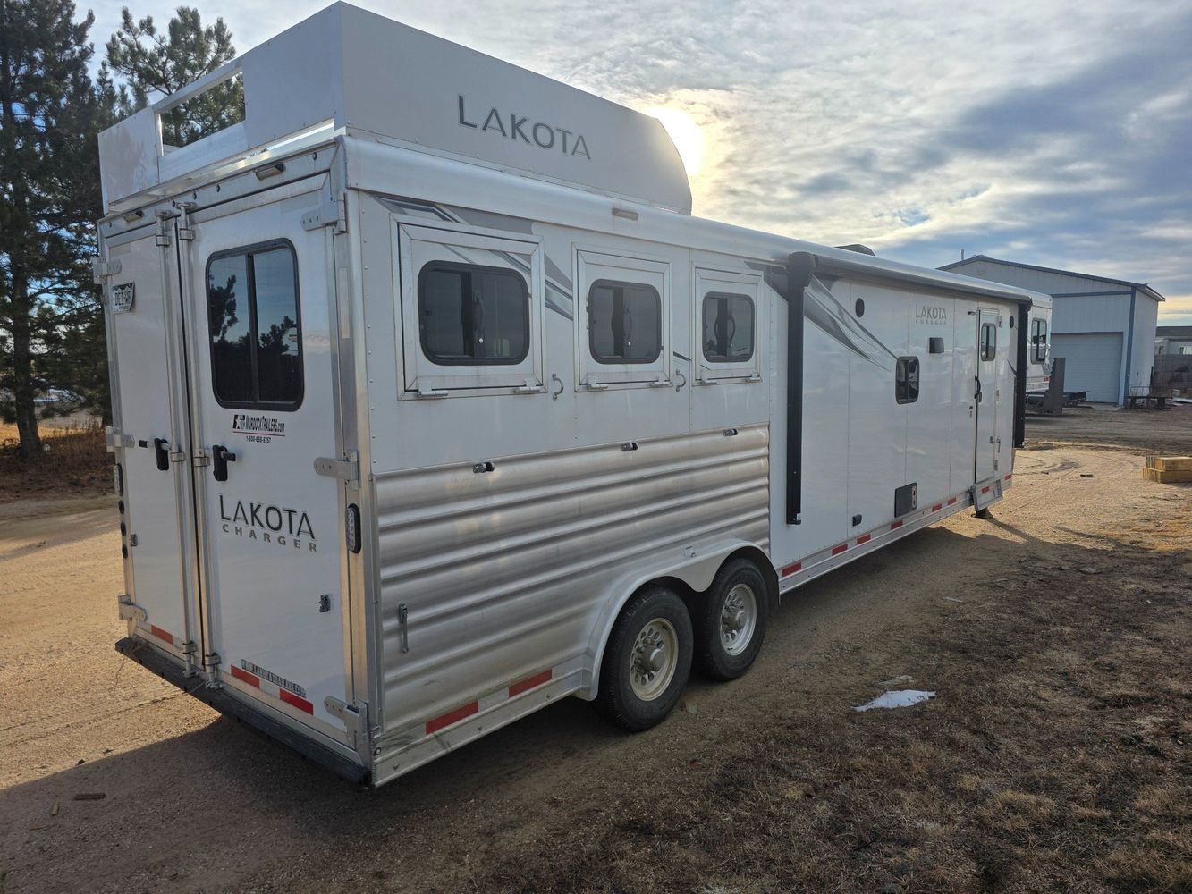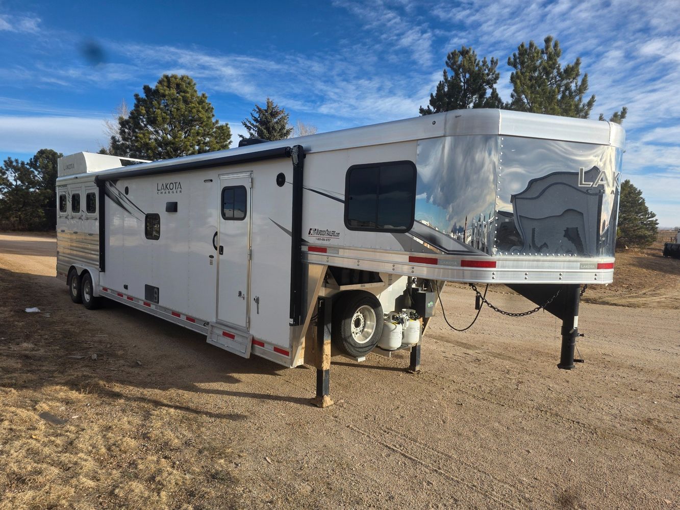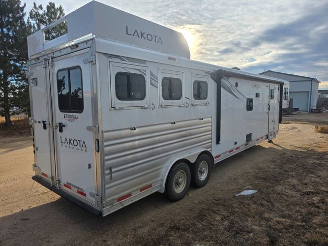 The 2023 Lakota Charger C8315 CWT is an 8-foot wide, 3-horse slant load living quarters horse trailer, featuring a 15-foot short wall with a slide-out, all-aluminum build, insulated horse area, hydraulic jack, power awning, and extensive amenities for both horses and people.