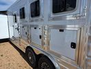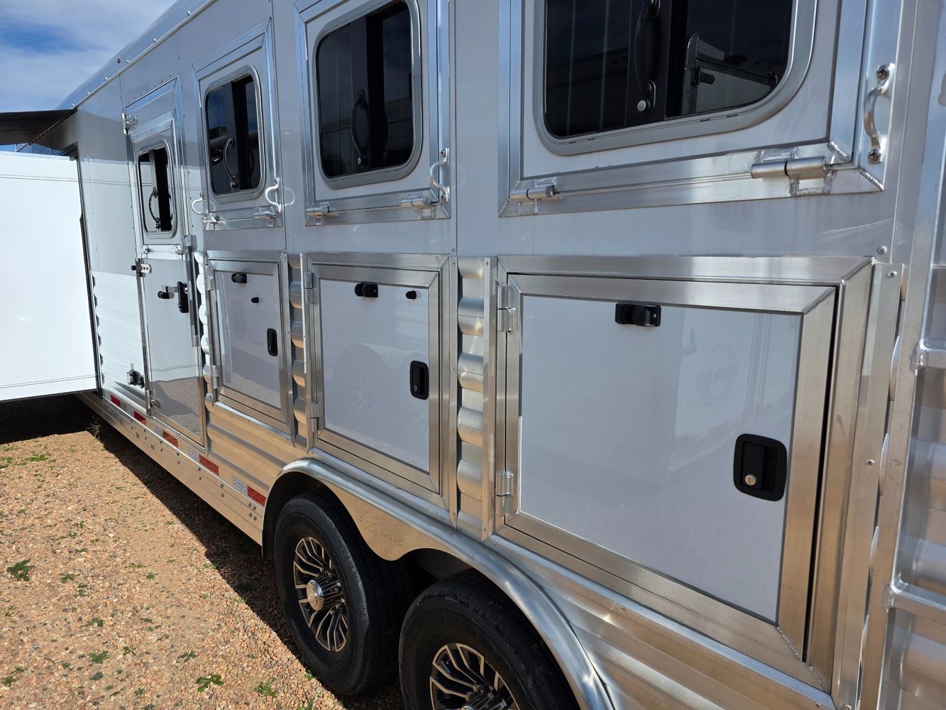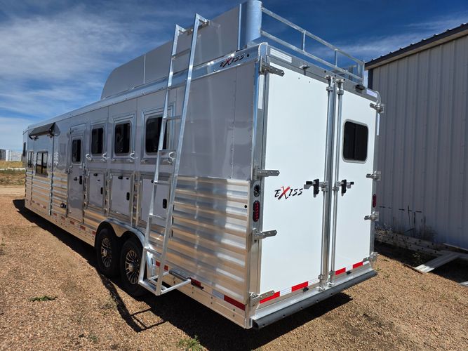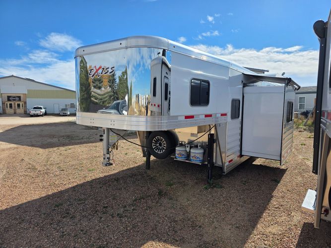 Check this new 2025 Exiss 8414. This is a new floorplan for Exiss. With Exiss' upgrade to all wood cabinets this trailer is ready for adventure. It is a 4 horse with mangers, escape door, collapsible rear tack and Easy Care Flooring. The interior is a 14' sw with a couch against the bulkhead and a dinette in the slideout. There is lots of storage with the pantry, including cabinets above the dinette, couch, in the nose and closets in the bathroom.